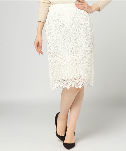 オンオフ使える上品レーススカート!!後ろゴムになっているので履きやすさ抜群。どんなシーンでも使いまわしたくなる1枚。ブラウス合わせでビジネスシーンにも肌寒くなってきたらボリュームあるニットとのスタイリングで女性らしい着こなしがおすすめ!裏地有りです。※サイト上のサイズ名と、 お届け商品に記載されているサイズ名が異なる場合がございます。
