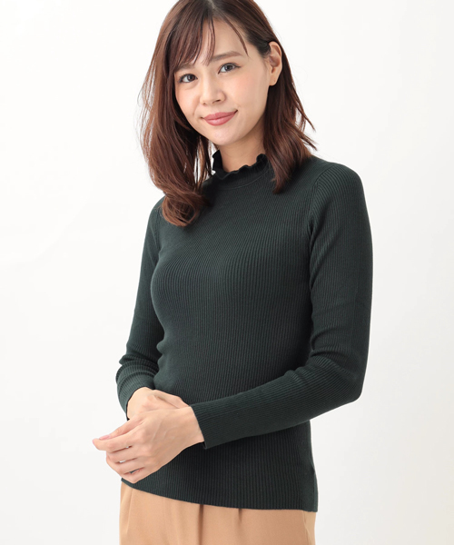 フリリーなハイネックデザインが上品な甘さをプラスする、大人可愛いニットプルオーバーです。ボディに優しくフィットするリブ地で、着こなしをスマートな印象に見せてくれる効果も◎ メイン使いはもちろん、ワンピースのINに合わせたレイヤードコーデにと、幅広く活躍してくれるアイテムです。