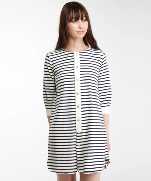 しっかりとした質感のコットン天竺地を使用。カットソー素材を前立てやカフスでシャツワンピースのように仕立てました。すっきりとしたクルーネックが爽やかに、ボーダーやイカリマークのボタンにもマリンテイストが感じられるひと品です。 1枚でワンピースとして着用するのはもちろん、フロントを開けてカーディガン感覚でも着用頂けます。デニムと合わせてカジュアルに、ベレー帽などコワザの効いた小物をプラスするのも◎。衿元がスッキリしているので、大きめアクセとも相性よくコーディネートがきまります。 原産国:日本 モデル着用サイズ:ONE SIZE model:H169 B82 W59 H84 店舗へお問い合わせの際は下記品番をお伝えください。 品番:13-26-0899-138