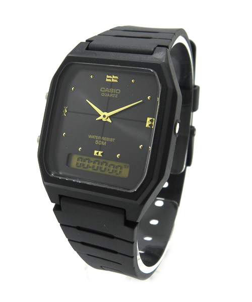 シンプルなフォルムのアナログ×デジタルモデル。ゴールドのインデックスが特徴的です。ストップウォッチ、アラーム、カレンダーと必要な機能はばっちり装備。普段使いに最適な1本です。プレゼントやギフトにもおすすめ。 ※箱はつきませんのでご了承くださいませ。