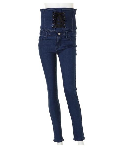 脚長効果バツグンなスキニーデニムは、コルセット部分が取り外せて、印象ががらりと変わる2WAYデザイン!くびれを強調しつつ、ストレッチが効いているのでリラックスして着こなせるのも魅力的なポイント◎フロントに添えた刻印入りボタンや、バックスタイルに効かせたゴムシャーリングも視線を上へと集めるポイントです♪シックな色使いでコーディネートにも取り入れやすく、ワードローブの即戦力として幅広い活躍が期待できそう★