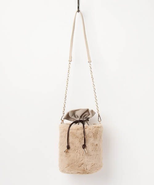 巾着型のショルダーバッグです。 今年らしいバケツ型シルエットとチェーンの組み合わせが◎ カジュアルスタイリングのポイントに合わせて♪