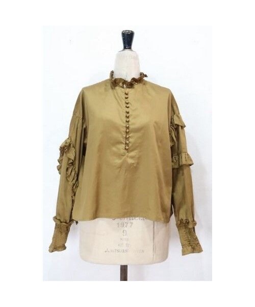 ブランド*rehersall カラー*キャメル モデル身長*156cm コットン100%のサテン素材で鈍い光沢があります。 袖にはアシンメトリーデザインのフリル。 ヴィンテージ感漂うブラウスです。