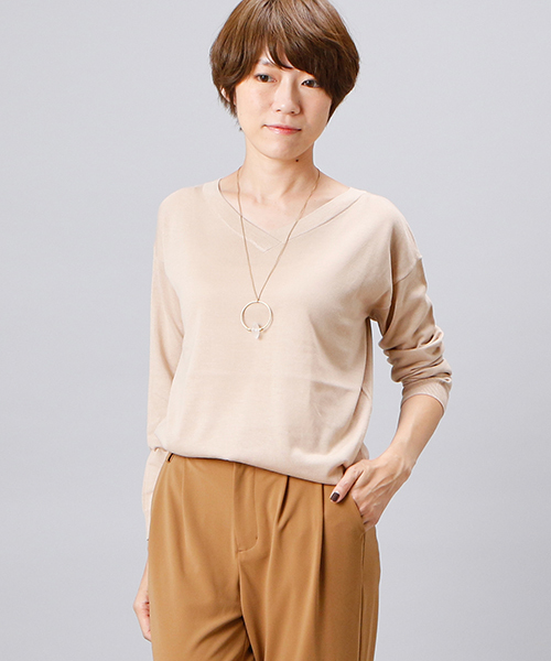 ハイゲージのきれい目プレーンニットプルオーバー。V開きが程よい深さで、デコルテラインを綺麗に魅せてくれます。ややゆとりを持たせ、身体のラインを気にせず着用いただけるのも嬉しいポイント。3シーズン着られる提案アイテムです♪オフィスにもプライベートにも使えて、着回し力抜群のニットはワードローブにおさえておきたい1着。