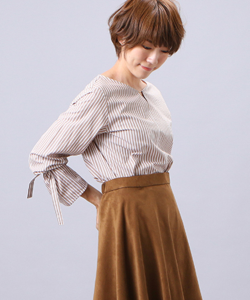 襟元にさりげないパイプデザインのブラウスです☆ 一番のデザインポイントは袖に入った紐リボンで 自由自在に結んでアジャストして着用して頂いたり、 アウターを着用する季節には袖口から紐を見せて遊んで 頂いたりと楽しんで頂けます。 上品なストライプ柄なのもボトムが選び易くて嬉しい 大人なブラウスです。