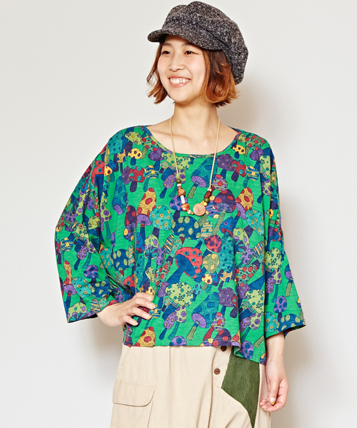 サイケデリックなきのこ柄のビックシルエットトップス★ユニークな柄とカラフルな色使いがポップで楽しい♪コーデのアクセントに活躍する個性的なアイテムです◎ ※こちらの商品は1点1点職人による手作りとなります。その為、形や色合いなど若干異なる場合がございます。あらかじめご了承ください。 Amina Collection Co.,LTD.