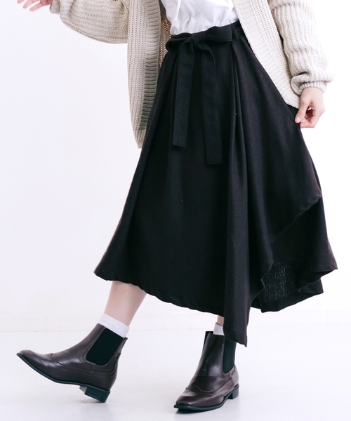 アシンメトリーな長さの裾とウエストリボンがフェミニン感満載のスカート。タックが入っているのでふわっとしすぎずカッチリと決まります。ゆるっとしたニットやタートルネックのニットなどとあわせるのがおすすめです◎