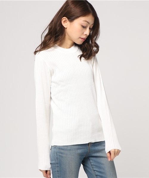 少し高さをもたせたネックデザインで品よく仕立てた、ワイドリブ編みのニットプルオーバーです。しっかりとした肌触りの綿混素材を使用しているので着心地も快適です。ハトメをあしらったバックのリボンデザインも大人レディなアクセントに◎ キャミソールタイプのワンピースと相性が良く、今年らしいスタイリングをお楽しみいただけます。
