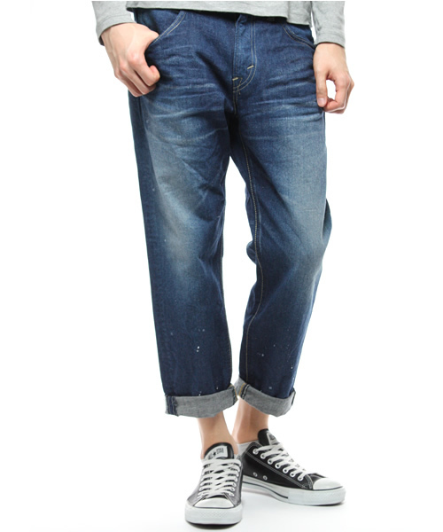 アメリカンラグシーの定番となっている、Leeとのコラボレーション。 腰に引っ掛けるぐらいのルーズフィットに腰周りを設定しながらも、テーパードを少し強めにかける事でシルエットをすっきりとさせたクロップド丈の5ポケットパンツに仕上げています。 立体ヒゲやこすり・ペンキ等の程良い加工を施し、若干濃い目の深みのある独特なヴィンテージ感を出しています。 生地・縫製・加工に至るまで全てを国内で行っています。 model:H181 B80 W68 H82 着用サイズ:30