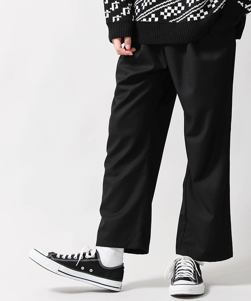ストレッチ性のある素材で仕上げたワイドパンツ。ウエスト周りから裾にかけて、ストンと落ちるシルエットでスタイルがよく見えるラインにこだわりました。 股上をやや深くとり、バックウエストをゴム仕様にする事でリラックスして快適に着用頂けるひと品。スラックスの穿きやすさはそのままに、アンクルカットで遊び心をプラスしたデザイン。 人気のロング丈トップスやスニーカーと合わせるような着こなしも今季オススメです。