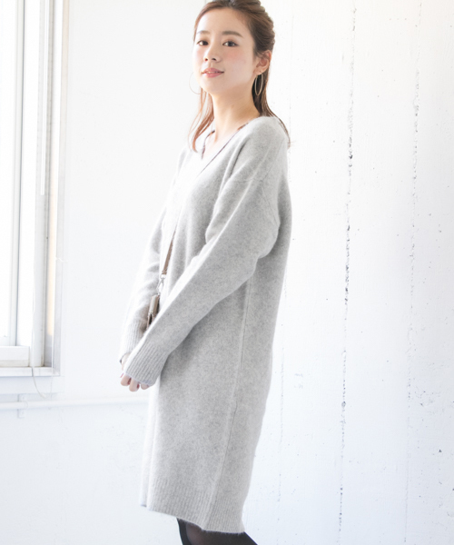 【毎年大好評のシリーズがさらに感触にこだわって新登場!】 空気をまとったかのように極めて軽いラクーン素材を使用したふんわりニット。1枚でも安心してお召しいただける便利な膝丈の設定と体のラインを拾わないゆったり身幅がラクチンなのにおしゃれ見えを叶える、大人の女性にとってまさに理想の1枚です。 もちろん暖かさは折り紙つき。着膨れ感が一切無いのに暖かい、1枚持っておけば秋冬に大活躍する優秀なワンピースです。 POINT ・Iラインに伸びる縦長シルエットが着痩せ効果を実現 ・デコルテを華奢に魅せるVネック ・ちくちくしないバツグンの肌触りと着心地 COORDINATE 1枚でタイツに合わせたり、デニムパンツと合わせても相性はバツグン。シンプルなデザインなのでウエストベルトでワンポイントにしたり、柄物のスカートを合わせても旬なスタイリングが叶います。ボリュームを抑えたシルエットなのでダウンコートのインナーやオーバーサイズのアウターのインナーにも活躍してくれます◎ ※この商品は、素材の特性上、着用初期はインナーや他の衣類・バッグなどに毛羽が付着し易くなりますが、着用していくごとに徐々におさまっていきます。 また、独特な風合いを出すために特殊な素材を使用しています。 そのため、素材の性質上、引っかけ・引っかかりやすくなっておりますので、ご注意ください。 ※その他お取り扱いに関しましては、商品に付属のアテンションタグをご確認の上、充分ご注意ください。
