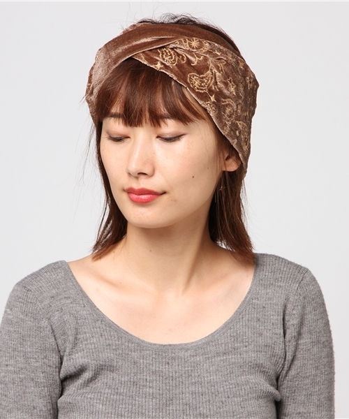 ベロア素材の2本仕立てで、ペイズリー柄を刺繍しているボリュ-ム感のあるヘアバンドです。