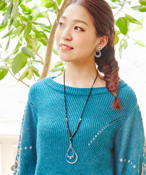 雫(しずく)型のワイヤーモチーフにキラキラした糸を編み付け、ガラスやウッドビーズを組み合わせたハンドワークのアクセサリー。エスニックスタイルはもちろん、カジュアルスタイルにも相性抜群!女性らしさを引き立てるロングネックレスです◎ ※こちらの商品は1点1点職人による手作りとなります。その為、形や色合いなど若干異なる場合がございます。あらかじめご了承ください。 Amina Collection Co.,LTD.