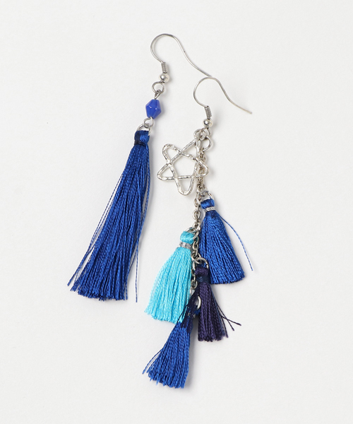 個性的なデザインのアシンメトリーピアス。片側はロングタッセル、もう片側は星のメタルモチーフを付けて流れ星のようなデザインにしました★片耳用ピアスとしてもオススメ◎色あざやかで艶感のあるナイロン素材のタッセルがコーディネートに彩りを添えてくれます★※こちらの商品は1点1点職人による手作りとなります。その為、形や色合いなど若干異なる場合がございます。あらかじめご了承ください。Amina Collection Co.,LTD.