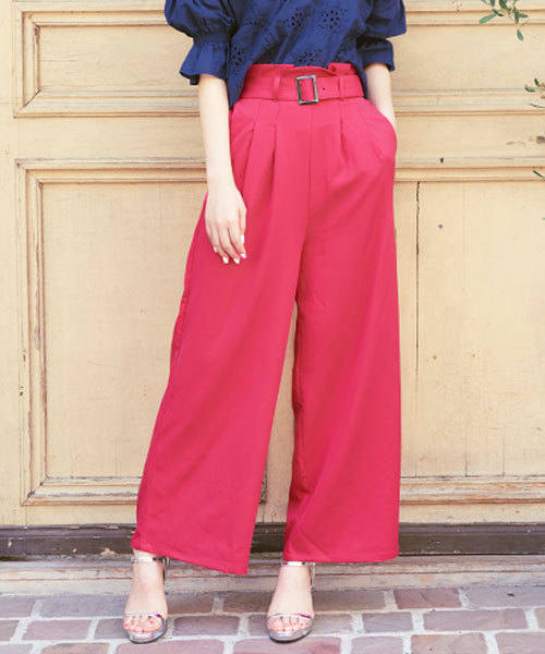 同素材のベルトが目を惹くシンプルでこなれたワイドパンツ。ややハイウエスト気味のデザインでかっちり着こなせます。【素材・サイズ感】 ほどよく張りのある生地感。ウエストは後ろゴムで着心地もらくちん◎ボリューム感がありながらもストンと落ちるシルエットは、シックな大人の雰囲気を演出。 【スタイリング】 タックで表情を加えた旬シルエットが、スタイリングに差をつけてくれます。ニットとスニーカーを合わせて大人カジュアルにも、パンプスを合わせてきれいめにも着こなせるアイテムです◎