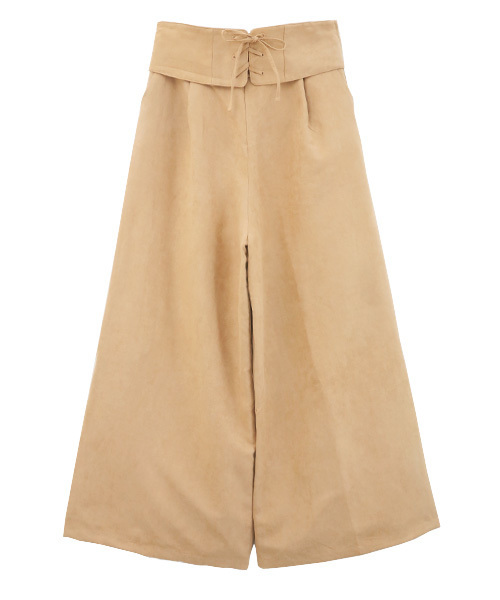 なめらかなフェイクスウェードがシーズンムードを グッと加速させるスウェードパンツ。 レッグラインを美しく見せてくれるワイドラインで ボトムコーデを更に楽しくしてくれるアイテム。 同素材のコルセットベルトは取り外し可能なので 他のアイテムと合わせても使えるスグレモノ! ベルトを外してシンプルなパンツとしても 着用できるので着こなしの幅が グッと広がります。 バック部分はゴムになっているので、 程よくボディにフィットして 履き心地も抜群です。 お出かけが多くなる季節に 絶対GETしておきたい1枚です。 ◆素材 なめらかで柔らかいフェイクスウェード素材。 伸縮性なし/透け感なし/裏地あり ◆ケア方法 ・30℃以下でのお洗濯をおすすめ致します。。 ・アイロンのご使用はお控えください。 ◆注意事項 *撮影場所やイメージにより 実際の商品と色味が若干異なる場合がございます。 商品のお色味はカラーバリエーション画像をご参照ください。