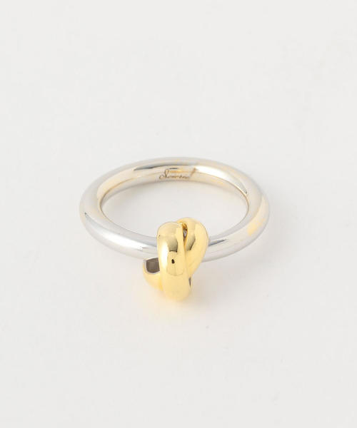 結び目を思わせるデザインが印象的な<Soierie>のリング。シンプルながらもインパクトがあり、手元に上品なアクセントをプラス出来ます。滑らかな表面感による美しい光沢も魅力。お手持ちのアクセサリーとの組み合わせた重ね付けもオススメです。ご自身用にはもちろん、ギフトにも是非。<Soierie>2009年よりスタートした、コスチュームジュエリーブランド<Soierie(ソワリー)>ブランド名はフランスにある絹の産地名から由来しており、過去と未来、異素材など相反する要素を織り交ぜたジュエリーを作ることから、“時を紡ぐ”をブランドコンセプトとして掲げています。ジュエリーによって、洋服という普遍的な物に驚きと輝きをもたらせたらと願い製作され、常に洋服とのスタイリングを意識し、着用時のバランスを計算しプロダクトされているコスチュームジュエリーです。店舗へお問い合わせの際は、全国のBEAUTY & YOUTH 各店舗まで下記の品名/品番をお申し付け下さい。品名:FC SOIERIE COIL KNOT RG 品番:1833-599-0311