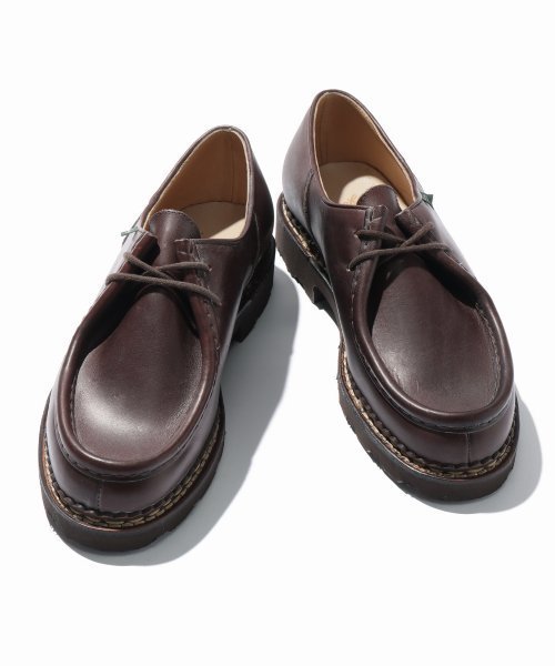 ParabootのMICHAEL 1945年に発表されたモデルで、チロリアンシューズと言われ、ノルヴェイジャン製法で作られた登山用・雪山用の靴として作られたシューズ。たっぷりと油分を含んだパラブーツオリジナルの「リスレザー」を使っており、雨が染みにくくなっています。更にソールは、天然ラテックスの特性を生かし、反発力や耐久性が高いのが特徴です。 【Paraboot】 1919年、レミー・リシャールポンヴェール氏が創業したフランスのシューズブランド。レミーが滞在先のアメリカで見つけた、ラバーで覆われたブーツにインスピレーションを受け、ブランドを象徴するラバーソールを使ったシューズを作り出した事をきっかけに大きく成長を遂げました。世界中でも、唯一ソールまでのすべての工程を自社で生産しているブランドでもあり、その高いクウォリティは世界中に顧客を抱えています。 ※革の中に含まれる油分が普通よりも多いため長時間未使用であると油分が表面に浮き、白く(まるでカビが生えたかのような)凝固して見えることがあります。そのような状態になりましたら、乾いた布、またはブラシでふき取るだけでまた元通りの光沢と風合いを楽しんでいただけます。