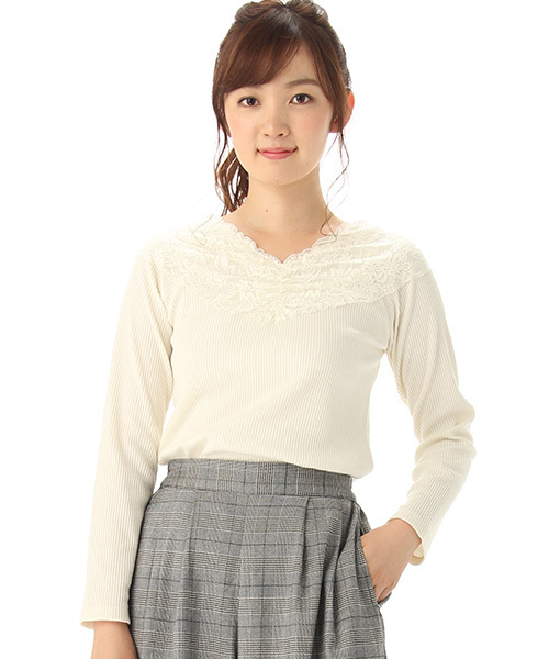 ネックラインのレースで女っぽく* ストレッチ入りのテレコ素材なので、タイトなシルエットでも快適な着心地。 ゆるトップスやVネックカーデからチラッと見せて重ね着を楽しみたい♪ 洗濯:手洗い可