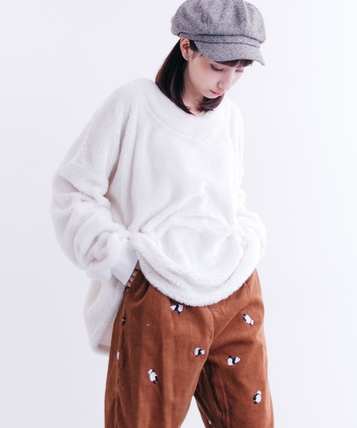 暖かさ抜群触り心地の良いファー素材が特徴的なプルオーバーです。襟元はVネックで首元をすっきり見せてくれやぼったくならないところもポイントです◎いつものボトムスに合わせるだけで一気に秋冬ムードなコーディネートに仕上がる1枚です。