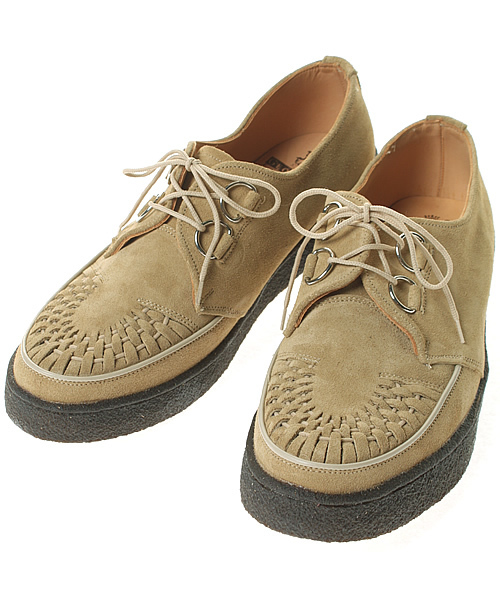 GEORGE COX(ジョージ コックス)。1906年にジョージ・ジェームス・コックス氏によってイングランドのノーザンプトン州に設立。1949年に伝統のグッドイヤーウェルテッド製法を用いたブローセル・クリーパーズ(通称ラバーソール)を開発し、その後クリーパーズをはじめとするジョージ・コックス社の製品は、50年代のテディ・ボーイ、70年代のパンク、80年代のロカビリーなど、イギリスのユースカルチャーの中で愛され続けています。 今回入荷したアイテムは、GEORGE COXの定番アイテムであるラバーソールシューズ。つま先部分のデザインもポイントとなるアイテムです。デニムやチノパンはもちろん、スラックスとの相性も抜群です。イギリス製。 品番:74314990406