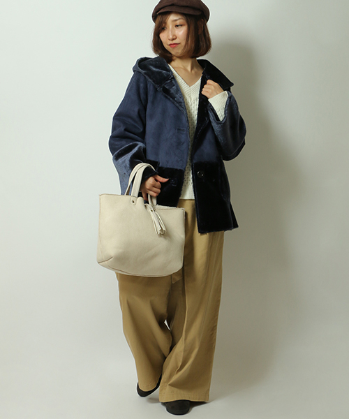 まるで本物みたいなしっとりしたタッチのフェイクスウェードジャケット。ポケットから下、袖周りはフェイクファーに切り替えてリッチなあたたかさに仕上がりました。フェイクファー部分もとっても優しい肌触りでフェイクとは思えない上品さ♪風を通さず軽くてあたたかな着心地です。[クリーニング]ドライクリーニング可(F)
