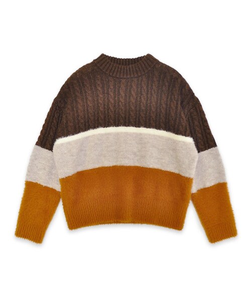 シンプルなケーブル編み、毛足が長くふわふわなシャギーニット、もこもこと毛羽立ったブークレの3種類のニットをミックスしたニットトップス。 短すぎない着丈でどんなボトムスとも合わせやすく、ゆるっと着られるオーバーめのサイズ感なので、インナーを重ねる事も出来ます。 首回りは肌に触れてもチクチクしにくいのも嬉しいポイントです♪ 袖口と裾はchick cardiganと同じ糸を使用しており、ふわふわで温かいのでこれからの時期にピッタリ。 濃い目の色合いが大人めなBrown、微配色で合わせやすいPink、寒色の組合せがメンズライクなBlueの3色展開です。