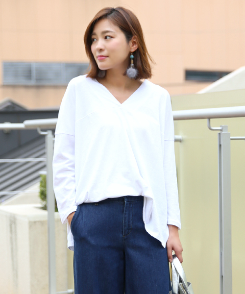 ◆Bab Bou Jeloud(バブ・ブージュルード)◆深Vネックが新しい!パンツスタイルにおすすめのロング丈のカットソー♪ゆるっとしたシルエットながらもデコルテをすっきり綺麗に見せてくれるデザインです。前後の計算された切り替え位置で広がりすぎない絶妙なシルエット◎ボトムインも出来る生地感なのでスカートやジャケット合わせもきまります!