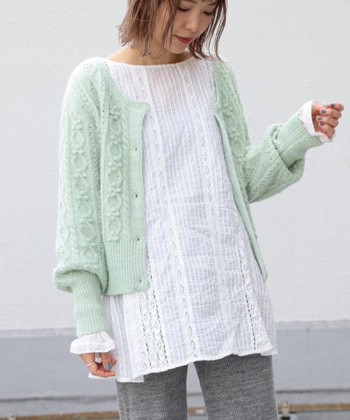 ケーブル編みにポンポンをつけた子供の頃に着ていたような懐かしい雰囲気のカーディガン。 少したぽっとさせた袖が今年らしいポイント。 コンパクトなサイズ感で羽織りとしても、フロントを閉じてトップスとしても着ていただけます。 優しい風合いとカラーも女の子らしく着ていただけるオススメの一枚です。 ※着用、お取り扱いの際は商品についておりますアテンションタグ、洗濯ネームを必ずご確認ください。 店舗へお問い合わせの際は、全国のAnother Edition 各店舗まで下記の品名/品番をお申し付け下さい。 品名:AEFC CBL PONPON CGN 品番:5615-199-0998 ※画像の商品はサンプルです。 実際の商品と仕様、加工、サイズ、素材が若干異なる場合がございます。
