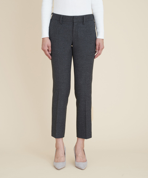 タテにもヨコにも伸びるウォッシャブル「ストレッチパンツ」 レーヨン混のストレッチ素材で肌触りバツグンのストレッチパンツ! ウールに見える素材にも関わらずご家庭の洗濯機で気軽にお洗濯ができ、シワにもなりにくいのでアイロンも必要ありません。 特有の高級感のある光沢が大人の着こなしを上品に演出してくれます。オフィスやちょっとしたフォーマルな場面でも活躍すること間違 いなし!上品で高級感あるウールライクな見え方がポイントです。 すっきりシルエットのトラウザー型“BELLINI”(ベリーニ)は、膝から裾に向かってゆるやかに細くなっているテーパードライン。 どんなシューズともバランス良く馴染む9分丈で、オンオフ使える優秀シルエットです。 お洗濯しても取れにくいセンタープレスが立体感のある脚のシルエットと、知的なムードを醸し出してくれます。 また、ベルト裏スエードパイピングはインしたトップスの滑り止めになり、シャツとの相性抜群です。 ●MARIEBELLE JEAN " MARIEBELLE JEAN (マリベル ジーン) "は2016年よりデビューしたブランド。 カジュアルなデニムは苦手な方やオフィスにも穿いて頂けるようなシルエットの美しさと、ずっと穿いていたくなるような穿き心地のよさにとことんこだわってつくられた、デニム&カラーパンツブランドです。 仕事もプライベートも、すべてを頑張るNYの女性をイメージし、オフィスカジュアルなきれいめなパンツを提案していく、モードとフェミニンの柔らかさを合わせもった「上品レディー」なブランドです。