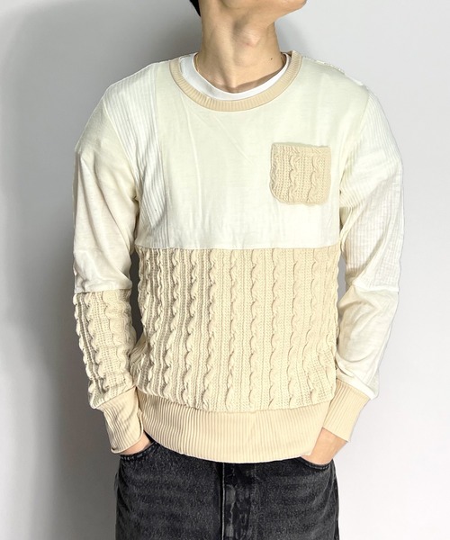 当店でしか買えないオリジナルアイテムのミックスニットクレイジーセーターです。リブ編み、ケーブル編み、ハイゲージニット3種類を組み合わせた1着です。形はシンプルですが色味が異なっていたり凹凸感があったりとシンプルでも個性を演出出来ます。1枚でもジャケットやコートの下にインナーとして使っても存在感のあるアイテムです。暖かみのある風合いで柔らかい素材もポイント。一味違ったセーターを持っておくと便利です。 ※実際の商品はモニタの関係上、若干色合いが異なる場合がございます。能色の物は洗濯の際色移りする場合がございます。 洗濯:手洗い可