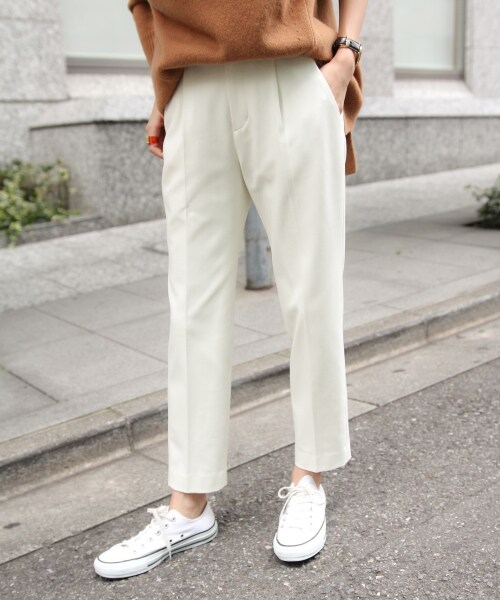 >TRの起毛加工のツイル素材。グレンチェックは表面感を意識し両面起毛加工をしています。>去年人気のシガレットパンツの形を生かしたパンツになります。起毛タイプの素材をピックアップ。また、前年よりハリ感のある素材をピックし、より上品で高級感のある一枚に仕上げました。>ボリュームのニットや、ボアコートといったボリューム感のあるトップスに合わせてカジュアルな着こなしも○ またフェミニンニットに合わせて通勤スタイルにもバッチリなアイテムです。