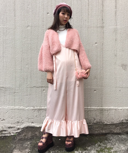 【LAST OFF!!残りわずかなため お早めに!!】 光沢感のある、サテン素材を使ったサロペット。 裾口をデコレーションしたフリルが、スタイリングをガーリーに導きます♪ 合わせるインナ―次第で、様々な表情が楽しめるのも嬉しい☆