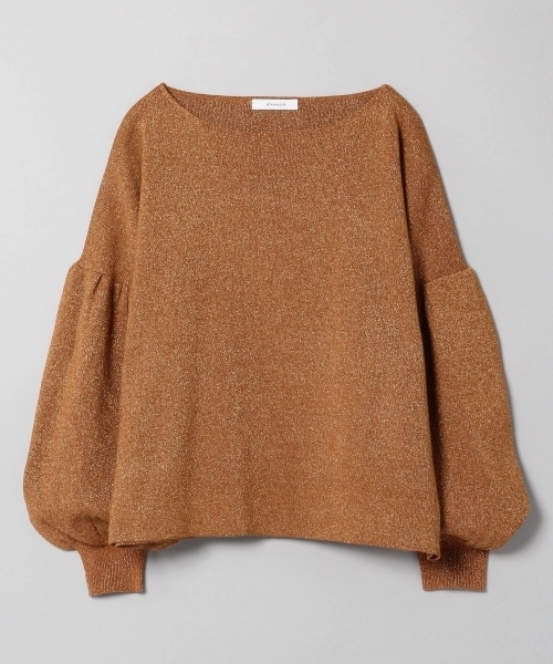 華やかなラメ素材が目を引く薄手のニットです! デコルテをスッキリ見せるボートネックと、ボリュームのある袖のデザインがポイント。 薄手で柔らかさのある生地なので、秋口からすぐに取り入れられるアイテムです! カジュアルなワイドパンツやデニムはもちろん、 細かく上品さのあるラメ素材はテーパードパンツと合わせたキレイめスタイルにもマッチします☆