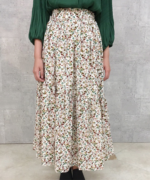 ◆Bab Bou Jeloud(バブ・ブージュルード)◆可憐な雰囲気の総柄フルーレットプリントスカートティアードの切替で立体的なシルエットのデザイン。ゆったりとしたフォルムとフルーレットの総柄でリラックス感をプラス!スタイリングのポイントとなる存在感抜群のスカートです。無地のニットと合わせて女性らしいキュートな着こなしでも、レザージャケットと合わせてハードさを女性らしさに変えてスタイリングするのもおすすめです。ウエストゴム仕様、裏地も付いてオールシーズン使えるスカートです♪