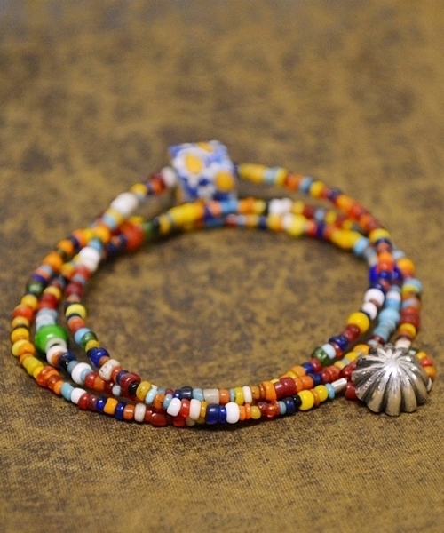SHIPS別注 NORTH WORKSのブレス&ネックレス ヴィンテージビーズや、ホワイトハーツ(白い心臓)と呼ばれる白いガラスの芯にカラーガラスをまとい、1800~1900年代にかけてイタリアはヴェネチアで製作され、貿易の際の交易品(紙幣の代わり)とされていた事でも有名なビーズをはじめ、アメリカはアリゾナ州スリーピングビューティー(眠れる森の美女)という非常にロマンを感じさせる鉱山で採掘され、空のように美しく均一な青色を特徴としたターコイズや、「NORTH WORKS」得意のモルガンダラーと呼ばれる、1878年~1904年、1921年にアメリカで発行された銀貨であるアンティークコインを使用したブレス&ネックレスです。 また新たに加わったカラフルなタイプは、1800年代後期~1900年初頭にかけて流通し、種のように小さなビーズで古くから世界各国の先住民に愛されてきたシードビーズをメインに、ホワイトハーツやミルフィオリビーズをミックスして仕上げています。 ネックレスとしての使用はもちろん、腕に巻きつければトレンドの重ね付けにも対応出来る絶妙の長さで仕上げているのがポイント。 バックボーンに富んだ味わい深いアイテムをセレクトし、熟練の職人達によって脈々と受け継がれるアイデンティティーと共に、ハンドメイドで仕上げた雰囲気さながら表情豊かに仕上がったアイテムを十二分に楽しめるアイテムになります。 型番:119-23-0653 原産国:日本 ※ホワイトで使用しております青色のビーズはホワイトハーツになりますが、メインの白色のビーズはホワイトハーツとは異なるヴェネチア産ヴィンテージビーズになります。予めご了承ください。 ※加工した留め具部分のデザインはコインのくり抜き部分により1点1点異なります。 ※原料にアンティークコインや金属、および天然石等を使用している為、1点1点形や色、大きさ等若干異なります。予めご了承下さい。