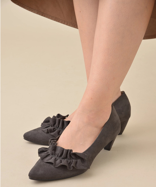 フリルディテールがフェミンムード漂うパンプス。クッション性のあるインソールでフィット感も良く、ローヒールなので歩きやすいのも嬉しいポイント◎ パンツやスカートなど合わせるアイテムやシーンを問わず、幅広いスタイリングに活躍してくれるアイテムです。