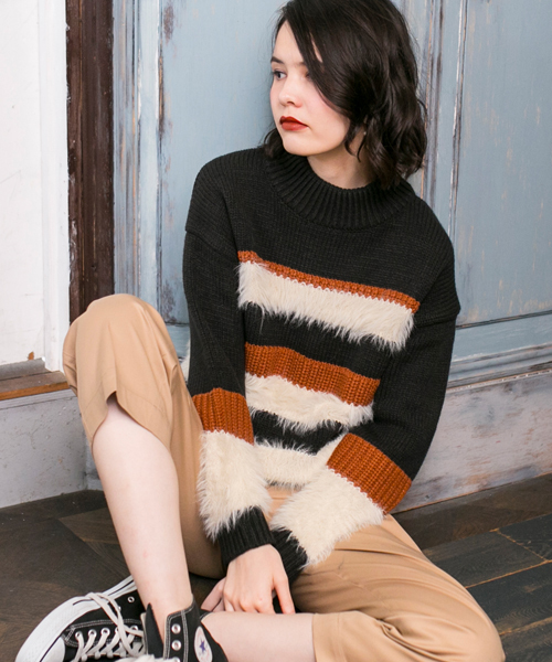 ★ブラック系大人気★ふわふわなフェザーヤーンとニットの組み合わせがキュートなニット。配色のボーダーデザインや異素材使いが個性の光るアイテムです。目のつまったしっかりとした質感で着易さも◎。ハイネックでこなれ感もありデニムに合わせるだけでオシャレに決まる♪ニットを主役にカジュアルコーデにまとめて★