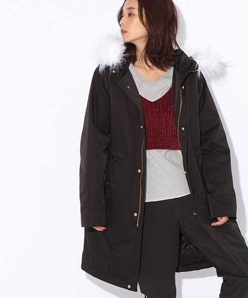 クッタリとしたコットンではなく、しっかりハリのある高密度のポリエステルツイルを使用し、 タウンユースな見え方に仕上げたミリタリーコート。 フードのファーは、通常の倍以上ののボリュームを持たせ、可愛さを出しました。 裏地との間に薄い中綿を入れ、キルトステッチを掛けており冬まで十分着れる、 見た目よりも保温性のあるデザインになっております。 ウエスト・裾はドローコードで絞れるのでシルエットをアレンジしても◎