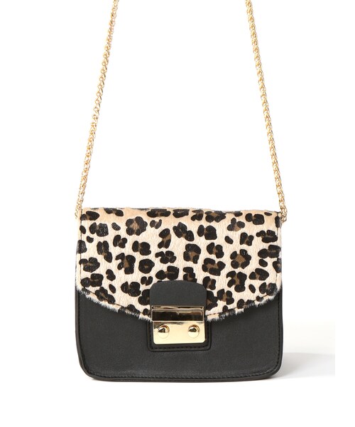 レオパードパターンのフラップ切替えデザインがエッジィなスパイスを添えるショルダーバッグ♪ スクエアフォルムがミニマルな印象に☆ ゴールドのチェーンでリッチな雰囲気をプラスしたアイテム◎ ★外ポケット:オープンポケット1個付き ★内ポケット:ファスナーポケット1個・オープンポケット1個付き