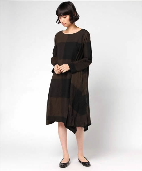 イレギュラーヘム、後ろのピンタック使いが立体的なフレアシルエットを構築するワンピース。大きなブロックチェックは不思議とカジュアル見えせず、大人っぽく着て頂けます。デニムスキニーやタイツとの合わせがおすすめ♪[クリーニング]手洗い可ドライクリーニング可(F)ウェットクリーニング(W)