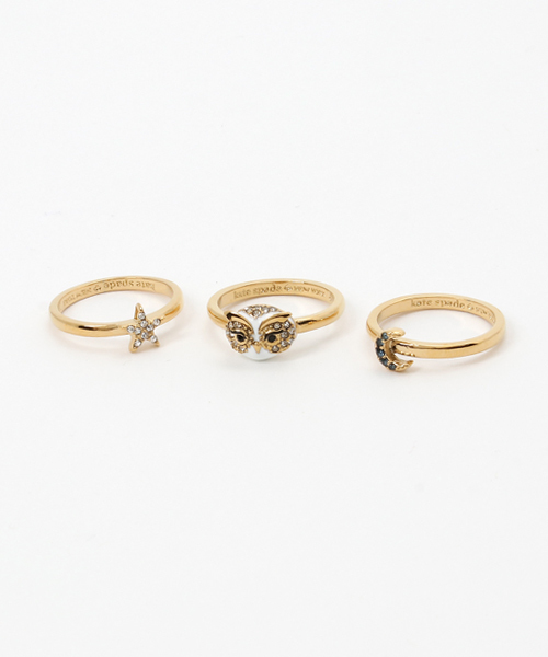 2017年の冬、ケイト・スペード ニューヨークはシベリアの夜空からインスピレーションを受けました。 シベリアの夜を思わせる、ふくろうと月、星をモチーフにしたユニークなリングが登場です。 一つの指に重ねると華やか、それぞれ別の指につけるとシンプルカジュアル、とその日の気分で使い分けできるリングのセット。 シンプルでキュートなデザインだからどんな装いにも合いそう。 *株式会社ケイト・スペード ジャパンが運営する公式ショップです。 *アフターサービスにつきましては、ZOZOTOWN カスタマーサポートへまずはご連絡ください。