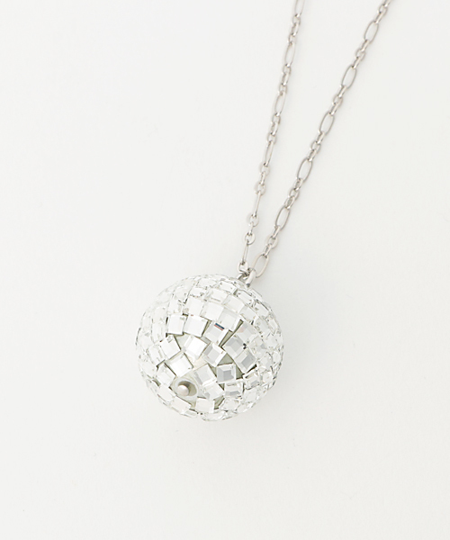 DISCOムードをぐんとあげてくれるミラーボールモチーフのネックレス。なるべく重たくないように素材にこだわったアイテム。ニットと合わせても存在感が出るよう、長めのチェーンがポイント。