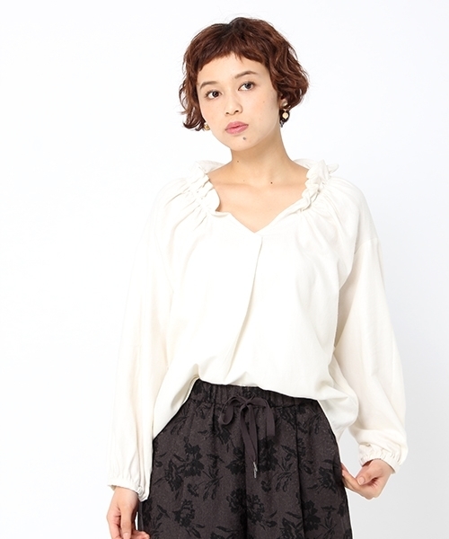 コットンの柔らかい起毛素材のプルオーバーブラウスです。衿元はさりげないフェミニンさが特徴のフリルカラーデザイン。すっきりと大人っぽく着こなせます。ニットカーディガン合わせにもお使いいただきやすい、おススメのブラウスです。