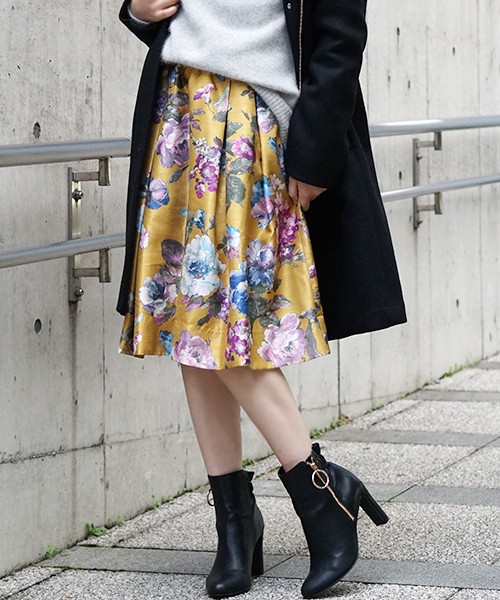 シャンタン生地独特のハリ感と手触りのフラワープリントスカート動きの出るシルエットバランスと高級感のあるフラワープリント、一枚で主役級のスカート。落ち着いた色合いで品良くみせてくれます。ウエストはゴム使用でテンションがあるのでサイズに幅をもたせています。タックギャザーなのでウエストまわりをすっきりとみせてくれるのも女子には嬉しいポイントですね♪トップスにふんわりニットや、シャツなどいろんなアイテムとの相性も良いので、ON、OFF共に活躍してくれるのでワードローブの幅がひろがります。アウターにライダースやフードコートなどお好みのコーディネートをお楽しみいただけるおすすめ商品の一つです。※取り扱いについては、商品についている品質表示でご確認ください。