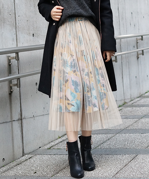 繊細な色使いの大花柄のサテンスエードに プリーツ加工を施した透け感のあるチュールを重ね使いしたスカート。 歩く度にふわりと揺れる姿は品が良く華やかな印象を与えてくれます。 ウエストはゴムギャザー仕様で着心地も楽です。 トップスにふんわりニットや、ライダース合わせで甘辛MIXも素敵です。 冬アウターとの相性もよく、ON,OFFともに活躍してくれるので ワードローブの幅も広がります。 ※取り扱いについては、商品についている品質表示でご確認ください。