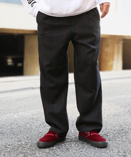 もはやメンズの定番ボトムスとなりつつある、ワイドパンツ。これからの季節にぴったりな逸品が登場。ビジュアルだけでなく、素材や穿き心地にもこだわりました。<デザイン>ももまわりがゆったりとしたワイドパンツは、締め付け感がなく快適そのもの。また、ワイドシなルエットはインパクトがあるので、シンプルなトップスでさえも旬な雰囲気にアップデートしてくれます。そんなワイドパンツに、柄タイプが登場しました。色展開はストライプ2色・チェック2色、計4柄の展開。ダークカラーが多くなりがちな冬のコーディネートの良いアクセントになること間違いなし。どのカラーもシックな色合いなので、着回し力も抜群です!<素材>サージ織りで仕立てた生地は、スーツのように高級感と洗練された印象が魅力。表面を微起毛しているので、あたたかな着用感であることもこれからの季節、嬉しいポイント◎※光の当たり具合で、商品と画像の色に若干差がある可能性がございます。ご了承ください。