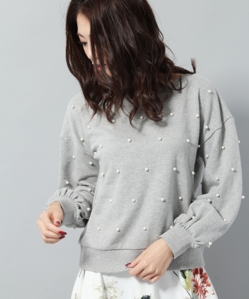 パールがランダムにちりばめられた裏毛トップスです。 きれいめなカジュアルアイテムで、フェミニンなスカートと合わせるのがアンデミュウらしい。 シルエットがでないデザインとストレスフリーな着心地です。