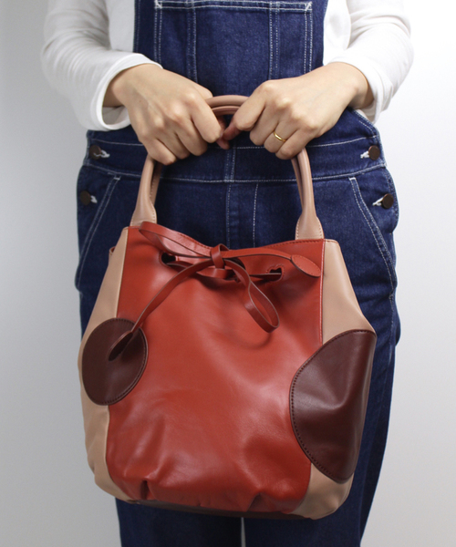 ラム革を使用した柔らかいレザーバッグです。素材違いのドット柄がポイントで可愛いです。前面のリボンもポイントです。内側もネコドット柄で可愛くなっていてファスナーポケット、仕切りが付いているので仕分けに便利です。カラーはブラック、ブラウンの2色展開です。
