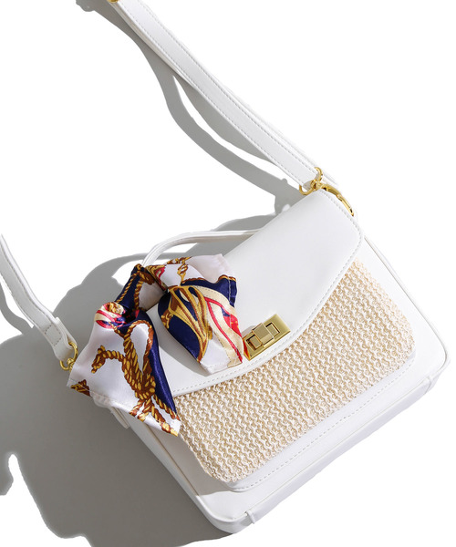 スカーフを取り付けたショルダーバッグ。付属のスカーフを取り外すことで、シンプルなバッグとしてもお使い頂ける2WAY仕様。 女性らしい雰囲気のミニバッグは、マニッシュなパンツスタイルからワンピースなどフェミニンな着こなしに合わせたりと、様々なシーンに活躍します。また、トレンドにも左右されづらく、年をまたいで長くご愛用頂けます。 お値段も手頃ですので、ご自身用は勿論、プレゼントにもオススメです。 ※実際の商品と仕様、加工、サイズが若干異なる場合がございます。
